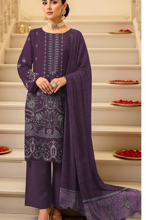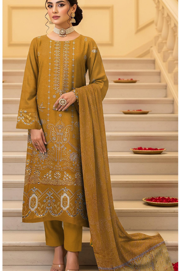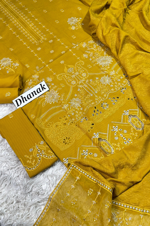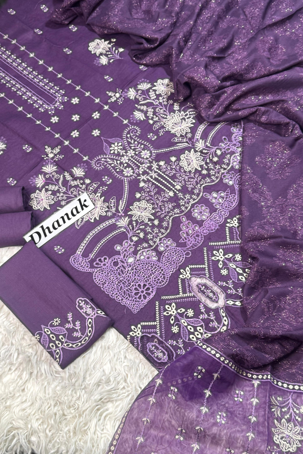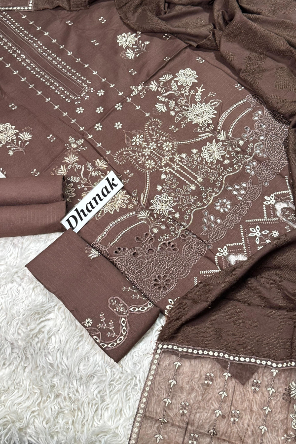 Shop Bana Doria Dhanak heavy embroidered 3PC suit crafted with intricate embroidery and paired with a luxurious velvet shawl for a refined winter look. Ideal for weddings, festive events, and formal wear, this Pakistani Dhanak suit blends warmth with timeless elegance.