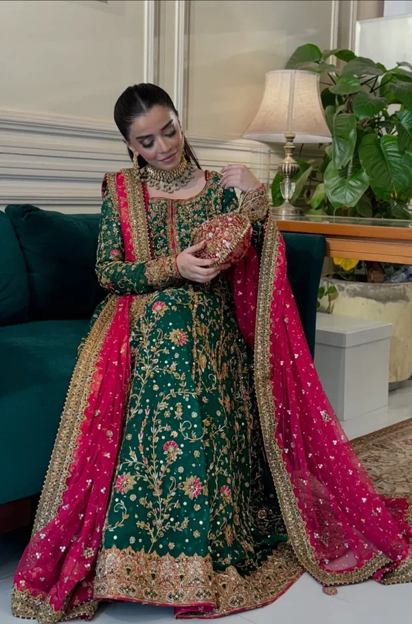 Step into luxury with this stunning green embroidered silk lehenga by Haris Shakeel. Adorned with intricate gold detailing, rich embellishments, and a contrasting pink dupatta — perfect for weddings and festive occasions.